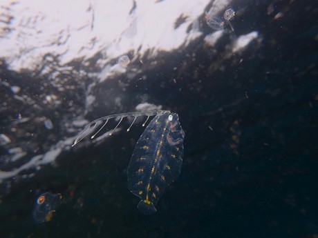 サルパ溜まりや中層をじっくり眺めて探すスタイル! まずはゲスト様が今日も見つけてくれました(^^♪ チゴタラの仲間の幼魚です、美しい..